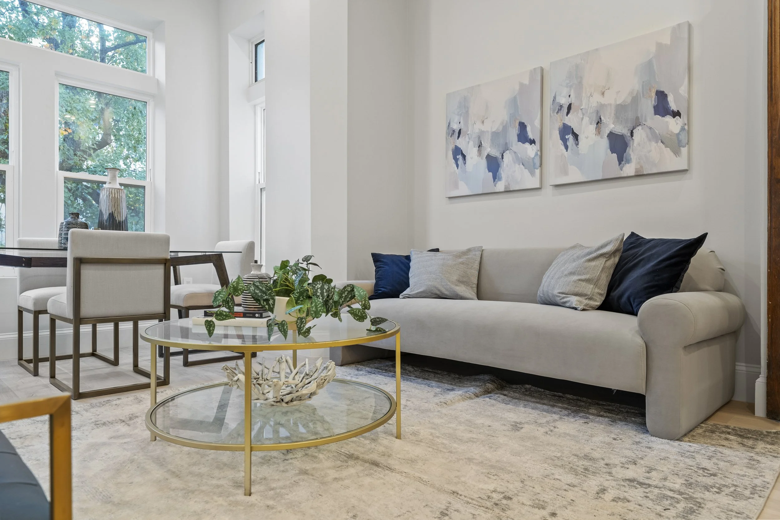 Soaring ceilings reflect morning light from the east-facing front façade windows. Ultra-wide-plank white oak flooring unify the open plan space. An eat-in kitchen features white oak custom cabinetry with integrated pulls, and a matching French door refrigerator and appliances. The kitchen also has Porcelanosa counters and full height backsplash, and gas range.
