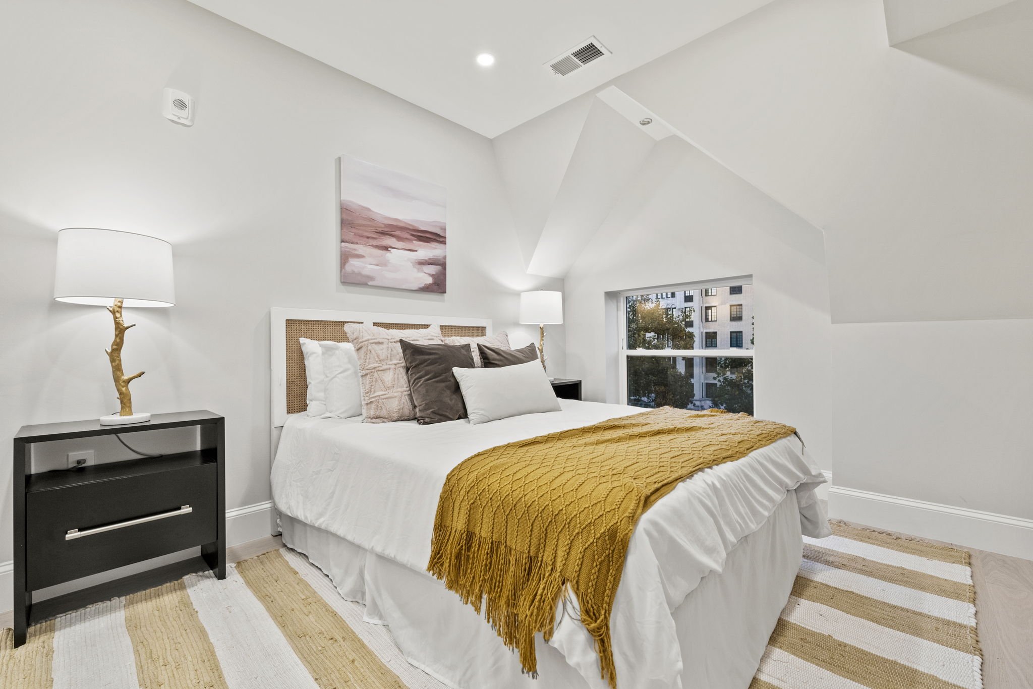 This Penthouse is accessed by an elevator from the ground level. When you enter you are immediately greeted by an enormous living space with high ceilings and white oak floors. The living room is given an extra touch of class and artistry with a gas fireplace and glass partition wall separating the living space from the stair case which leads to the second floor of the penthouse. As you step out onto the balcony, you are greeted by a tree lined view of 16th street and the Washington monument in the distance. The balcony is wrapped in a beautiful wrought iron pattern. This architectural feature is from the original construction of this Victorian row home. The foliage surrounding this balcony view is astounding during the fall season.